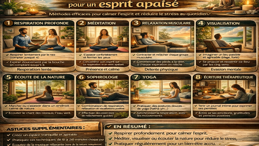 Parmi les techniques les plus efficaces pour apaiser l’esprit, la méditation occupe une place centrale. Elle consiste à concentrer votre attention sur un point précis, comme votre respiration, afin de calmer les pensées et réduire l’anxiété. La respiration profonde est une autre méthode incontournable, qui aide à diminuer le rythme cardiaque et à libérer les tensions physiques. Le yoga, quant à lui, combine des postures physiques avec des exercices de respiration, favorisant une harmonie entre le corps et l’esprit.