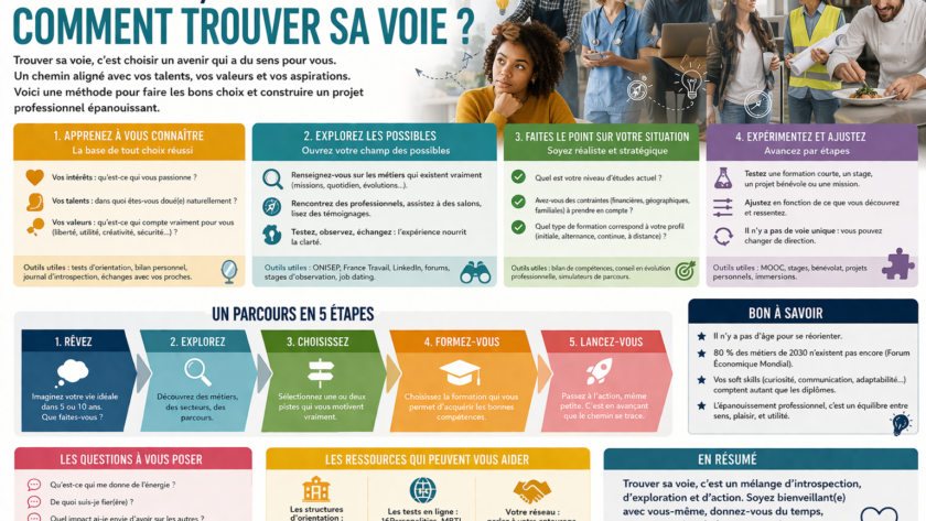Pour trouver sa voie, il faut savoir être patient avec soi-même, ce n’est pas en soi un éclair de génie qui vous fait trouver mais bien plus le nécessaire exercice sur soi. Cet exercice de réflexion commence premièrement par se rapprocher le plus possible de vos rêves, d’évaluer dans un second temps la distance qui vous sépare de vos rêves et des solutions possibles (testez vos idées et toutes les possibilités d’évolution de carrière). Cependant il peut arriver d’avoir des obstacles, comme le temps, la recherche d’un métier trop idéaliste ou alors la réalité du travail que cela représente. N’oubliez pas, si vous faites de ce que vous aimez vous deviendrez bon dans ce métier et le revenu augmentera en fonction de l’intérêt que vous lui consacrerez.