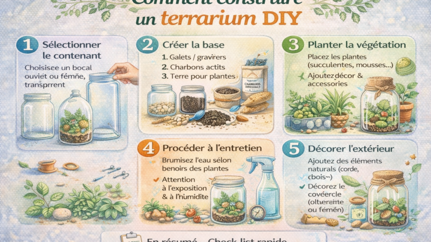 Depuis plusieurs années, le DIY connaît un véritable engouement, et parmi les projets les plus prisés figure la construction de terrariums. Ces mini-jardins encapsulés offrent une touche de verdure élégante et durable à tout intérieur, tout en étant incroyablement simples à entretenir. L’histoire des terrariums remonte au XIXe siècle, lorsque les botanistes les utilisaient pour étudier les plantes exotiques dans des environnements contrôlés. Aujourd’hui, créer son propre terrarium DIY est non seulement une activité relaxante, mais aussi une manière créative d’apporter la nature chez soi. Que vous soyez un amateur de jardinage expérimenté ou un débutant curieux, construire un terrarium personnalisé vous permet de laisser libre cours à votre imagination tout en profitant des bienfaits des plantes.