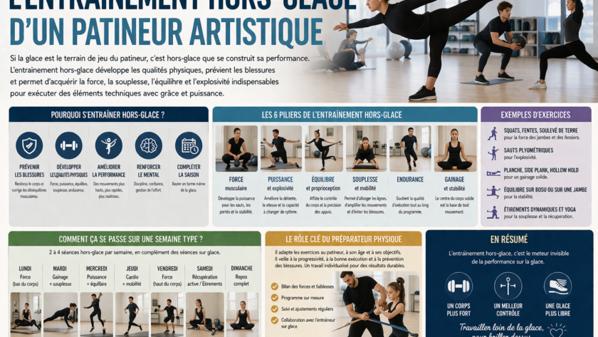 Hormis l’entraînement de ses sauts et des autres positions à la patinoire, le patineur doit également effectuer un autre échauffement, qui est un entrainement hors-glace. C’est un travail disciplinaire et préparatoire qui a pour but d’améliorer les performances lors des sorties sur glace.