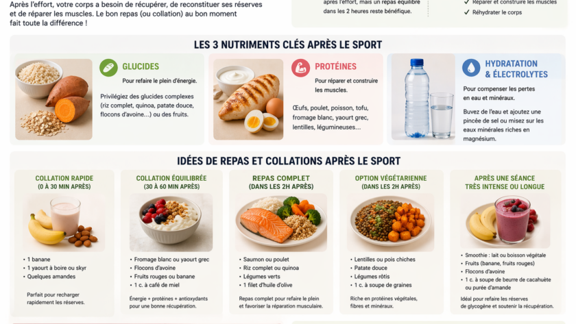 Il est important de ne pas négliger la phase de récupération après le sport, car elle permet d’éviter la fatigue lors des futurs entraînements et de réduire les courbatures par la suite. La consommation de glucides comme le pain, les pâtes, les pommes de terre ou le riz permet de reconstituer les réserves de glycogène dans les muscles utilisés pendant l’activité. Les sources de protéines telles que le poulet maigre, les œufs, les haricots, les produits laitiers ou le poisson fournissent les acides aminés nécessaires à la réparation et à la croissance des muscles. De plus, l’hydratation avec de l’eau ou des boissons pour sportifs remplacera les fluides et les électrolytes perdus par la transpiration pendant l’exercice.