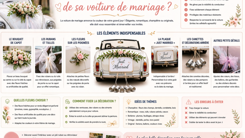 La voiture de mariage est l’un des éléments les plus importants de toute journée de mariage. Qu’il s’agisse d’une voiture classique, d’une limousine vintage ou d’un véhicule moderne, les bonnes décorations peuvent rendre votre voiture de mariage magnifique. Voici notre guide étape par étape sur la façon de décorer votre voiture de mariage.