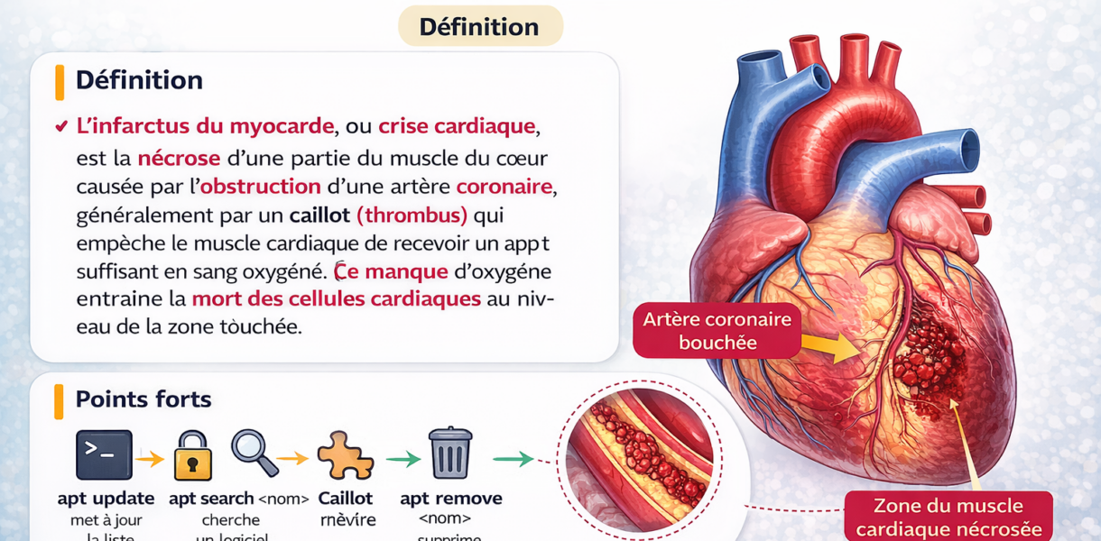 L’infarctus du myocarde, couramment appelé « crise cardiaque », correspond à la destruction d’une zone du muscle cardiaque à la suite de l’obstruction d’une artère …