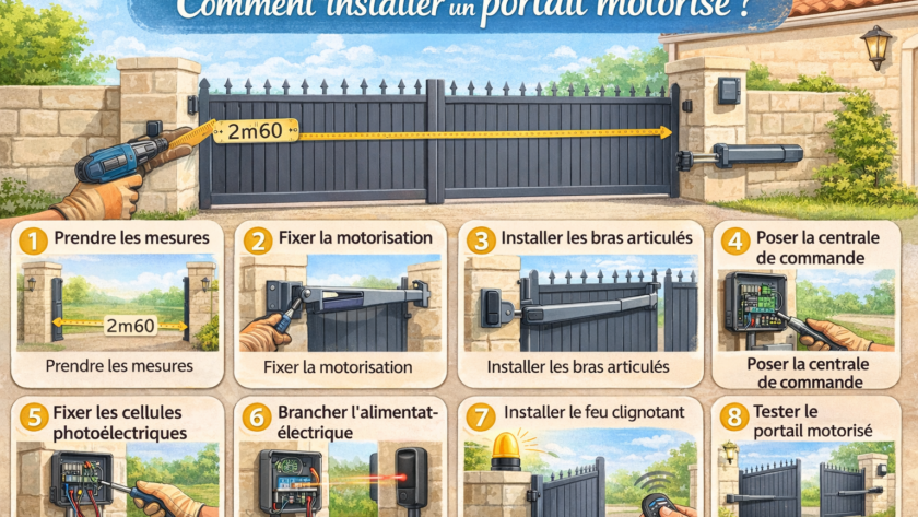 L’installation d’un portail motorisé se déroule généralement en plusieurs étapes clés. Tout d’abord, fixez solidement les supports de motorisation sur les montants du portail, en veillant à ce qu’ils soient bien alignés et stables. Cette étape est cruciale pour assurer le bon fonctionnement du moteur et la sécurité du portail.